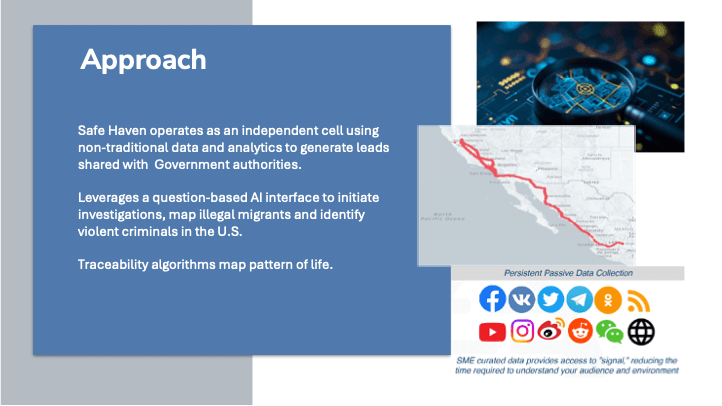 Project SAFE HAVEN (SH) transforms the way we identify, locate, and map both illegal migrants and the criminals who have crossed into the U.S. over the past several years. By harnessing a multi modal, multi domain approach, SH taps into years of organically collected data, cutting edge analytic techniques, advanced tools, and powerful algorithms.